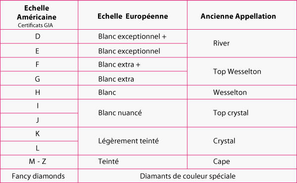 Colour (couleur) : La détermination de la couleur s’effectue par un professionnel expérimenté et par comparaison avec une série de pierres-étalons.