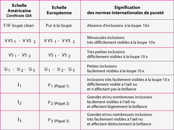 Clarity (pureté) : La pureté doit être déterminée par un professionnel, à la loupe au grossissement 10 fois.