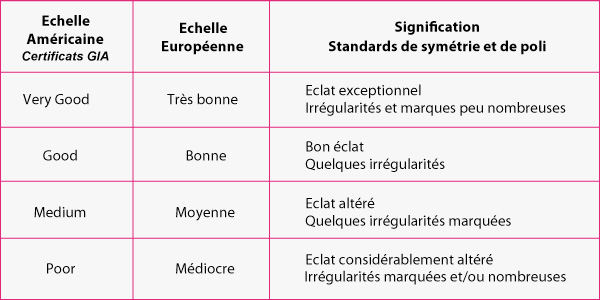 Correspondance des différentes appréciations de symétrie et de poli selon les standards utilisées.