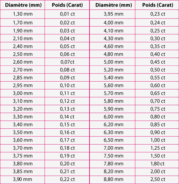 Correspondance entre le diamètre d’un brillant (diamant rond) et son poids.